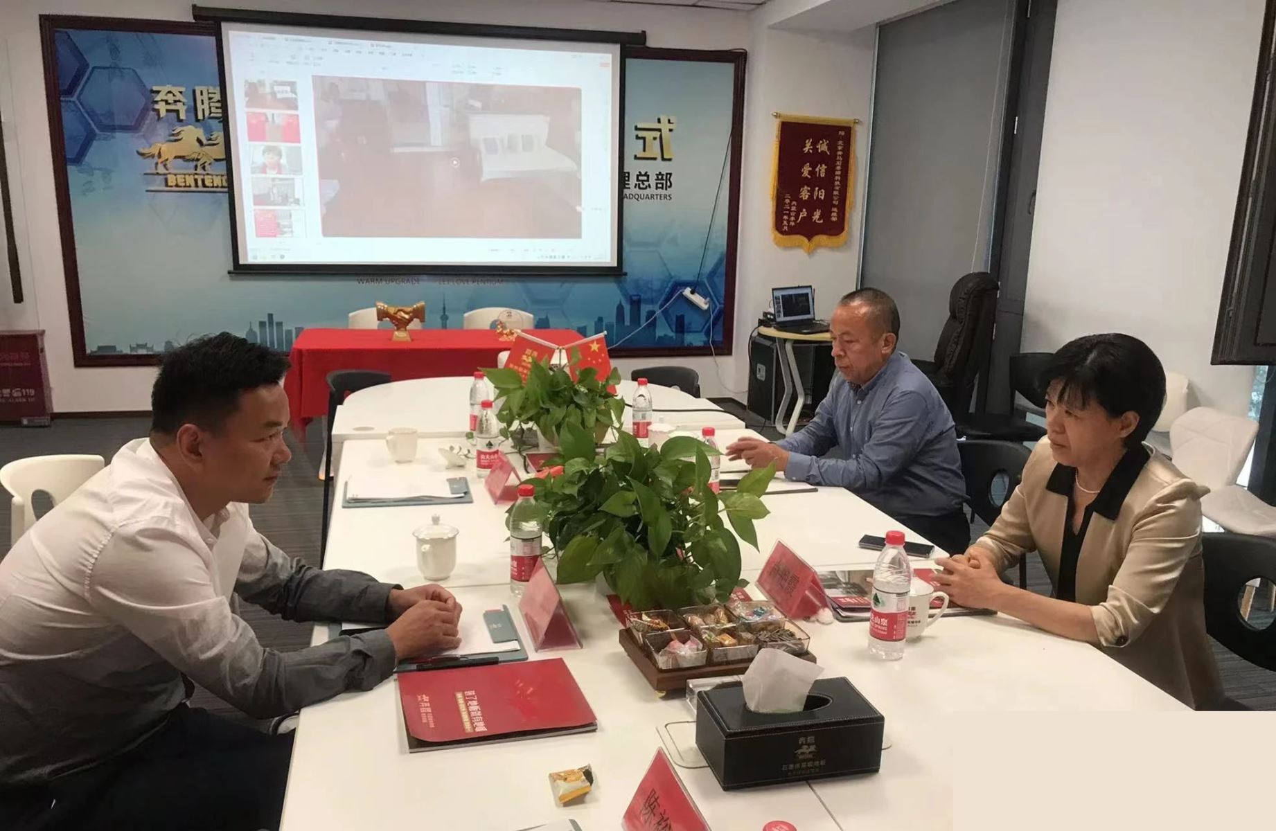 奔腾商务部吕经理首先给领导们介绍了奔腾企业理念和愿景,以及奔腾冠名的“奔腾号”高铁,高铁广告直接面向消费人群,塑造强势品牌传播影响力。其次介绍了奔腾的一些施工案例,比如国家体育馆鸟巢、国家电网党校宿舍楼、天津诺威尔能源股份有限公司、山西太原大棚花卉等,领导们听了吕经理的介绍,对奔腾有了更深入的了解。