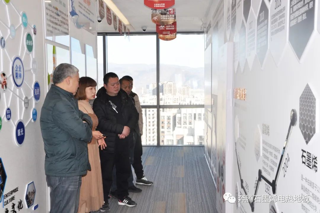 随后,高经理带着李总、王总他们到奔腾产品展厅,首先介绍了奔腾品牌的企业文化和经营理念,以及我们奔腾冠名的奔腾号高铁,直接面向消费人群,塑造强势品牌传播影响力。其次介绍了奔腾一些施工案例,比如国家体育馆鸟巢、天津诺威尔能源股份有限公司、山西太原大棚花卉等。奔腾石墨烯采暖地板受邀参与鸟巢解决上万座椅的供暖需求计划的设计,对场馆内进行现场测量,以便提供解决方案。也正因此,奔腾石墨烯采暖地板和北京冬奥会结下了不解之缘!同时给李总、王总详细介绍了奔腾石墨烯采暖地板与传统电采暖产品对比优势,一改传统取暖的高消费高能耗,填补了行业巨大空白,给家居、办公带来了时尚、健康、温暖的生活方式,创新科技产品,嫁接传统装饰,平民的价格,享受尊贵的生活品质。